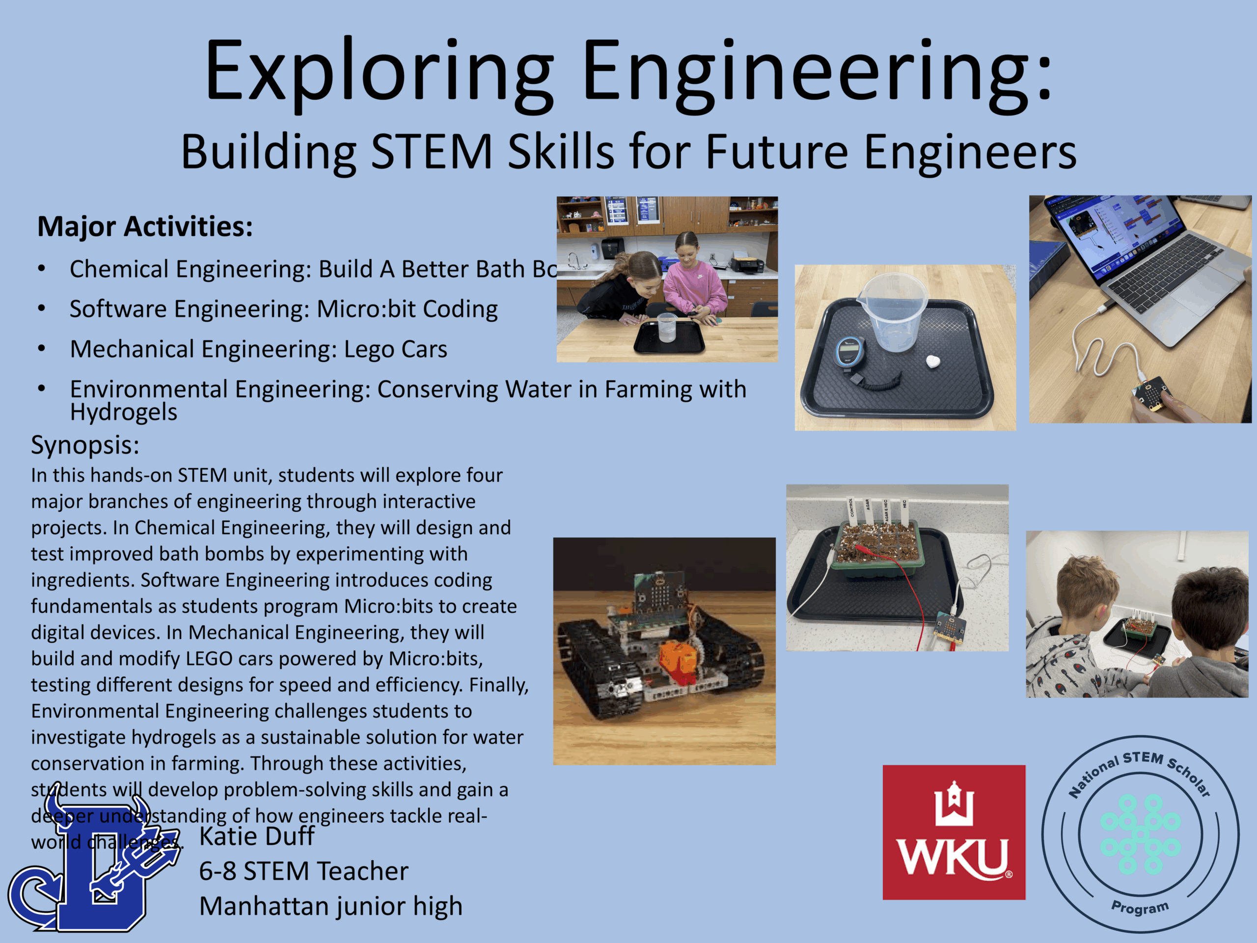 Download The Poster (PDF)Sudent’s will engage in the fields of chemical, civil, software, and environmental engineering through hands-on STEM challenges combining research, experimentation, and problem-solving challenges by learning to: